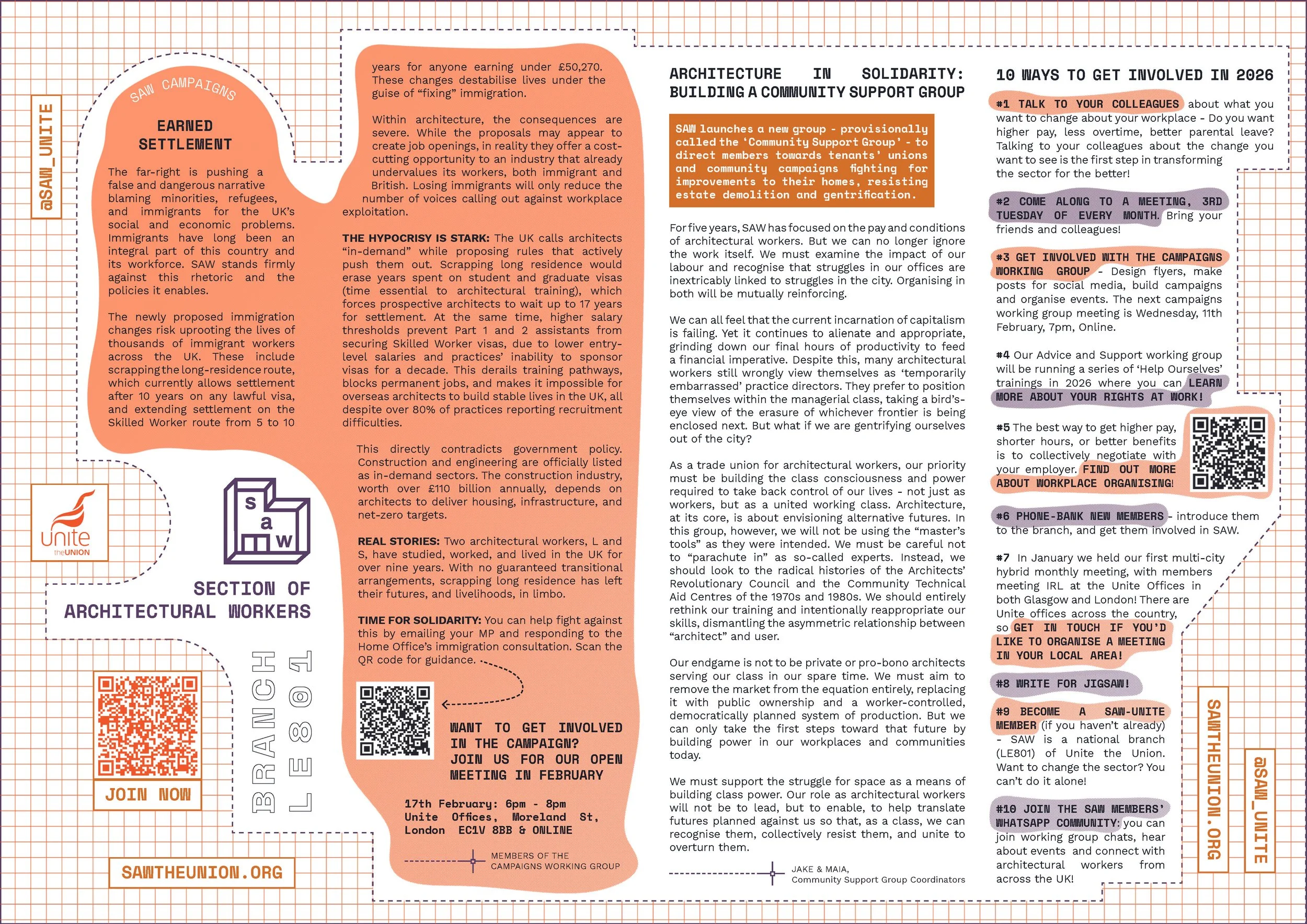 JigSAW is SAW-UNITE’s workers’ bulletin - written by architectural workers for architectural workers. This issue of JigSAW features details on our Earned Settlement Campaign, debates on ARB registration, 10 ways to get involved in 2026 and more…
